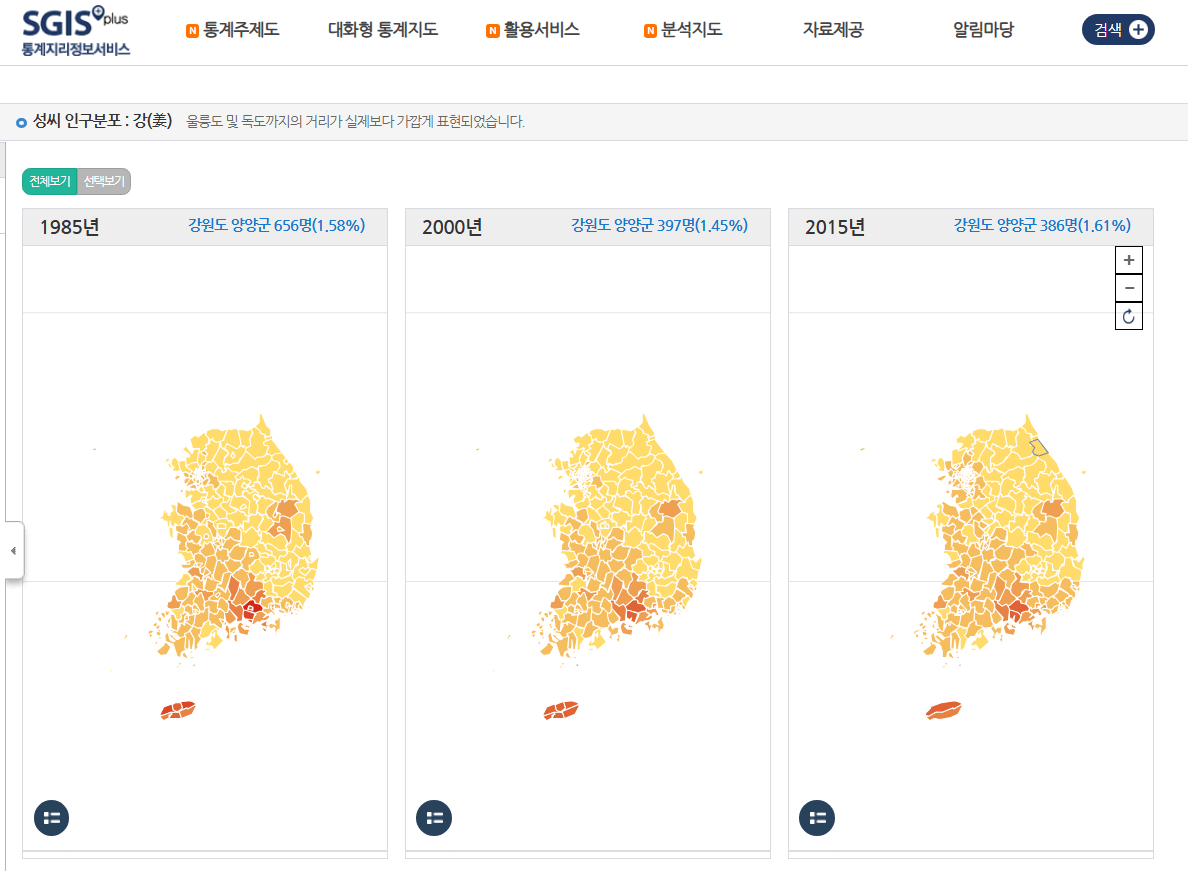 이 서비스는 1985년, 2000년, 2015년의 데이터를 바탕으로 성씨별 인구 분포를 시·군·구 단위로 확인할 수 있도록 구성되어 있습니다.