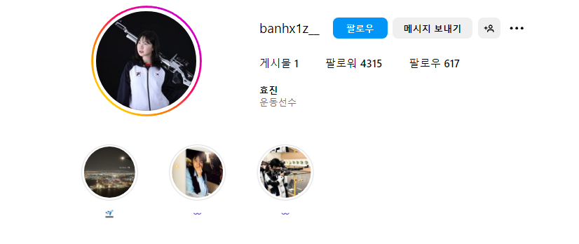 국가대표 반효진 선수의 인스타그램입니다. 게시물은 한 개밖에 없지만 ^^;;; 요즘 학생들 보면 인스타그램에 게시물 잘 안올리는 경우도 있더라구요. 웃는 모습이 매력적입니다. 나이가 16살이면 한창 친구들과 놀고 마라탕 먹고 다닐 나이인데, 대견하네요.