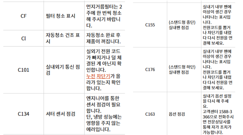 하지만 같은 에러가 계속 반복되거나 실외기가 작동하지 않을 정도의 증상이 있다면 무조건 서비스센터 점검이 필요합니다.