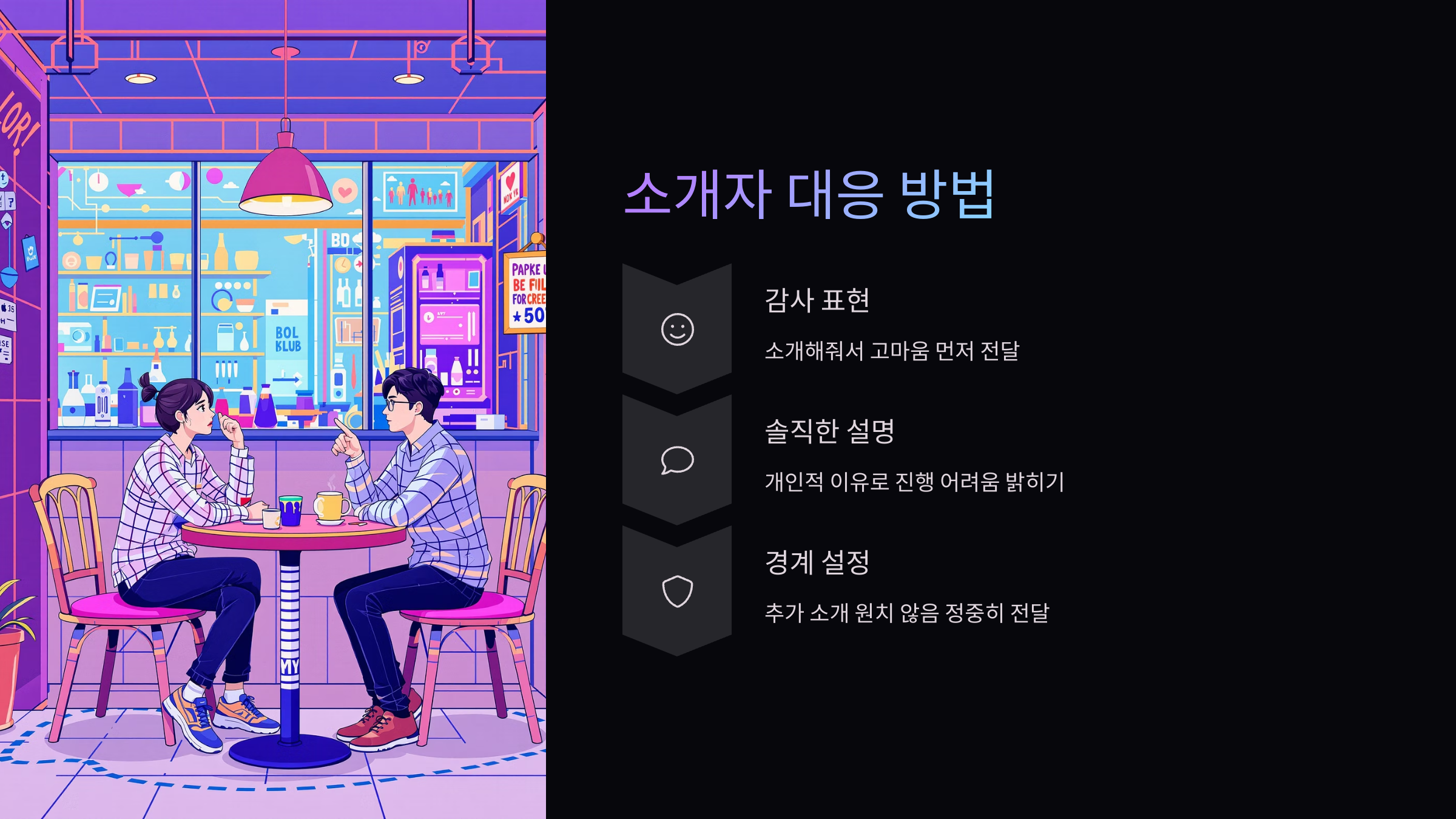 그렇다고 바로 단호하게 거절하자니 상대방이 상처받을까 걱정되고, 너무 오래 끌면 오히려 더 민망해질 수 있죠.