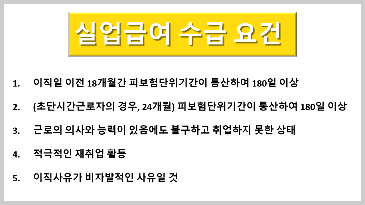 피보험단위기간이란 고용보험료가 산정되는 근무일수가 180일 이상 되어야 한다는 뜻입니다. 실제적으로 근무 일수를 계산했을 때 약 7개월 이상은 일을 해야 180일 이상의 조건을 채울 수 있습니다.