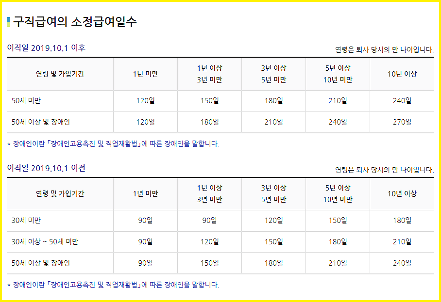 - (이직 일이 2019.10.1 이전은 퇴직 전 평균임금의 50% × 소정 급여일수)