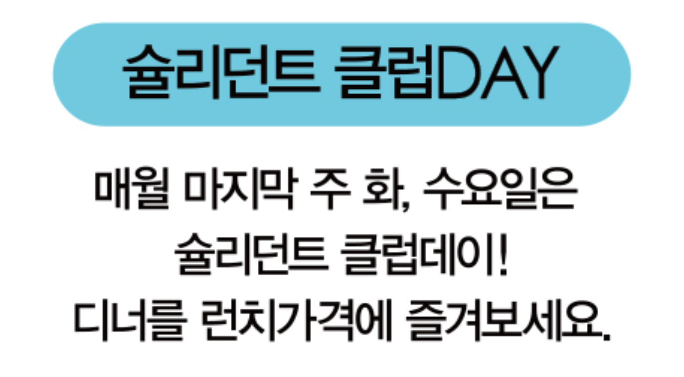 현장에서 해당 서류를 제시하면 할인된 가격으로 식사할 수 있으니, 학생분들은 월말 슐리데이를 꼭 기억해두시는 게 좋습니다.