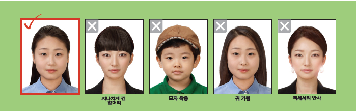 - 머리 장식이 없는 것이 원칙이며, 장신구로 인해 얼굴이 가려지면 안 됩니다.