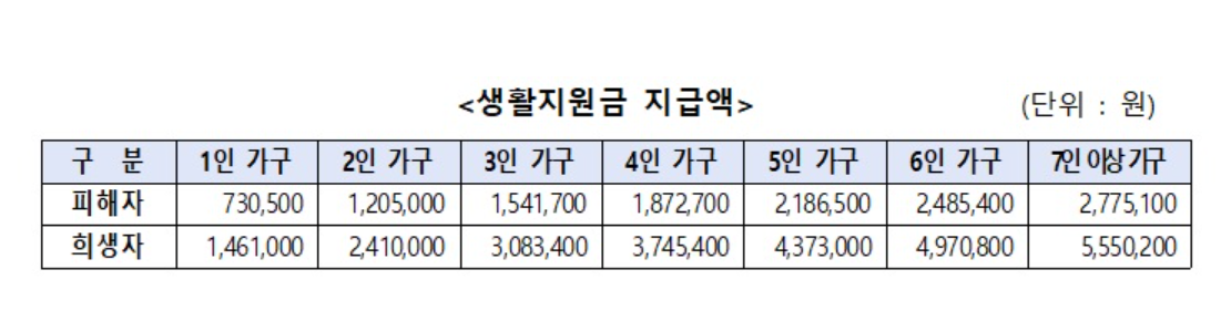 생활지원금은 희생자 또는 법에 따라 인정된 피해자가 속한 가구 구성원 수를 기준으로 산정하게 됩니다.