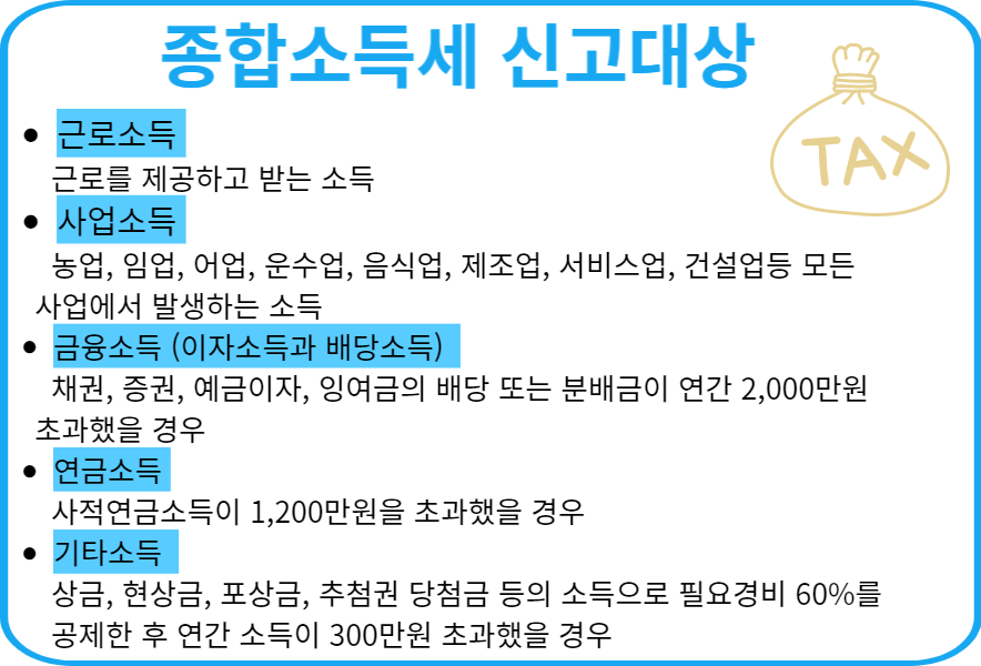 - 금융소득 (이자소득과 배당소득) : 채권, 증권, 예금이자, 잉여금의 배당 또는 분배금이 연간 2,000만원을 초과했을 경우