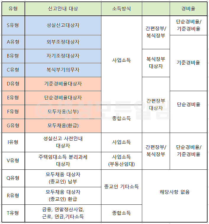 종합소득세 유형은 S, A, B, C, D, E, F, G, I, V, Q , R, T 등 기본적으로 13가지 유형이 있습니다. 하지만 좀 보기 어렵기 때문에 알파벳이 없어지고 신고안내 대상이라는 이름으로 변경이 되었는데요. 유형별로 어떤 차이점이 있는지 정리를 하면서 세무서에 맡기는 것이 나을지도 한번 알아보도록 하겠습니다.