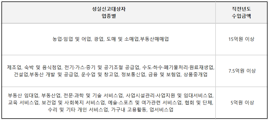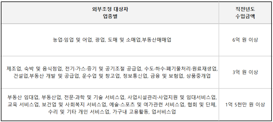 - 수입금액이 업종별로 일정규모 이상인 개인사업자 (5억원 이상 ~ 15억 원 이상까지 업종별로 다름)