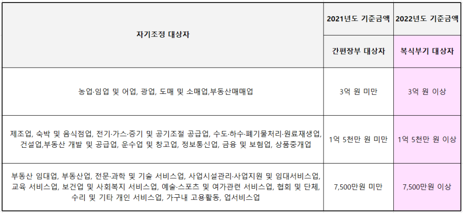 기준금액은 위의 금액을 보시면 되는데 업종별로 3억 미만에서 이상으로 전환되면 이렇게 자기조정 대상자가 됩니다.