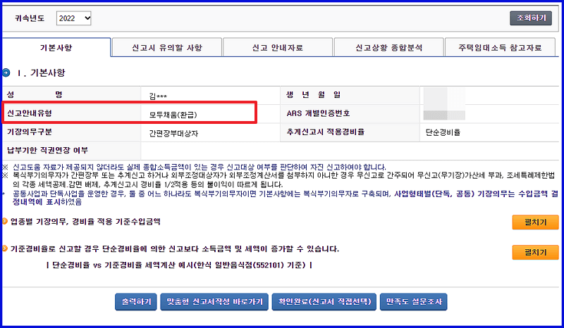 신고안내유형에 보시면 본인이 해당되는 유형이 나와있습니다. 간편 장부대상자라고 되어 있으면 간단하게 신고가 가능하고 만약 복식장부라고 나와있으면 그냥 세무사에 맡기십시오. 아니, 매출이 2,400만 원만 넘어서면 세무서에 맡기는 것이 편합니다.