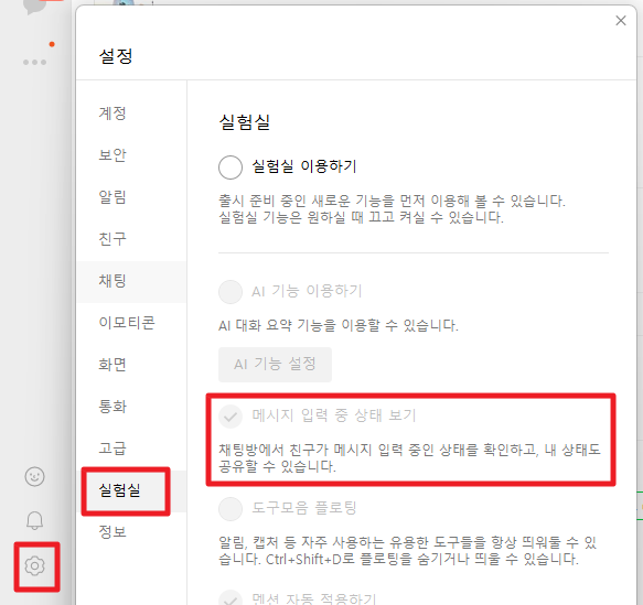 실험실 안에서 ‘메시지 입력 중 상태 보기’ 항목의 토글 스위치를 비활성화(OFF)로 변경합니다.