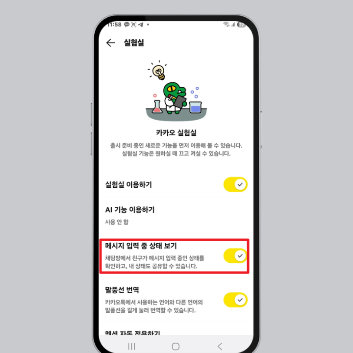 카카오톡 모바일 앱에서는 실험실 메뉴를 통해 입력 상태를 끌 수 있도록 되어 있습니다.