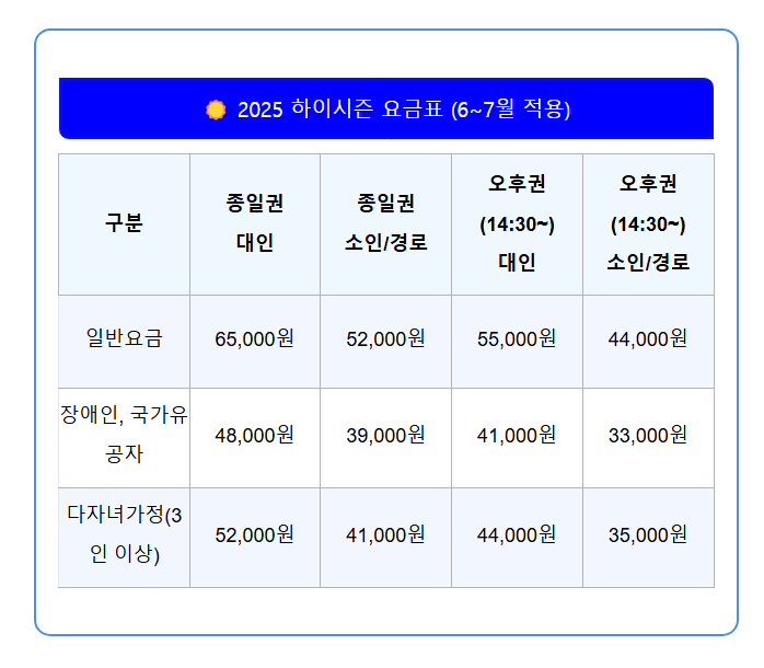 각 시즌은 운영 시기와 혼잡도에 따라 요금이 차등 적용되고 있으며, 동일한 입장권이라도 시기별로 가격 차이가 발생할 수 있습니다.