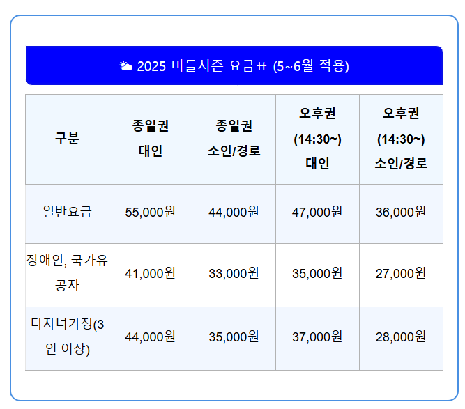 - 오후권 활용: 14:30 이후 입장 가능한 오후권을 이용하면 비용을 절감할 수 있습니다.