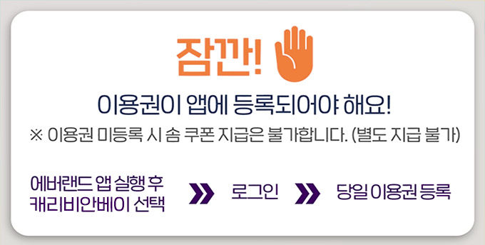 이용권 등록은 [에버랜드 앱 실행] → [캐리비안베이 선택] → [로그인] → [당일이용권 등록] 순서로 진행하시면 됩니다.