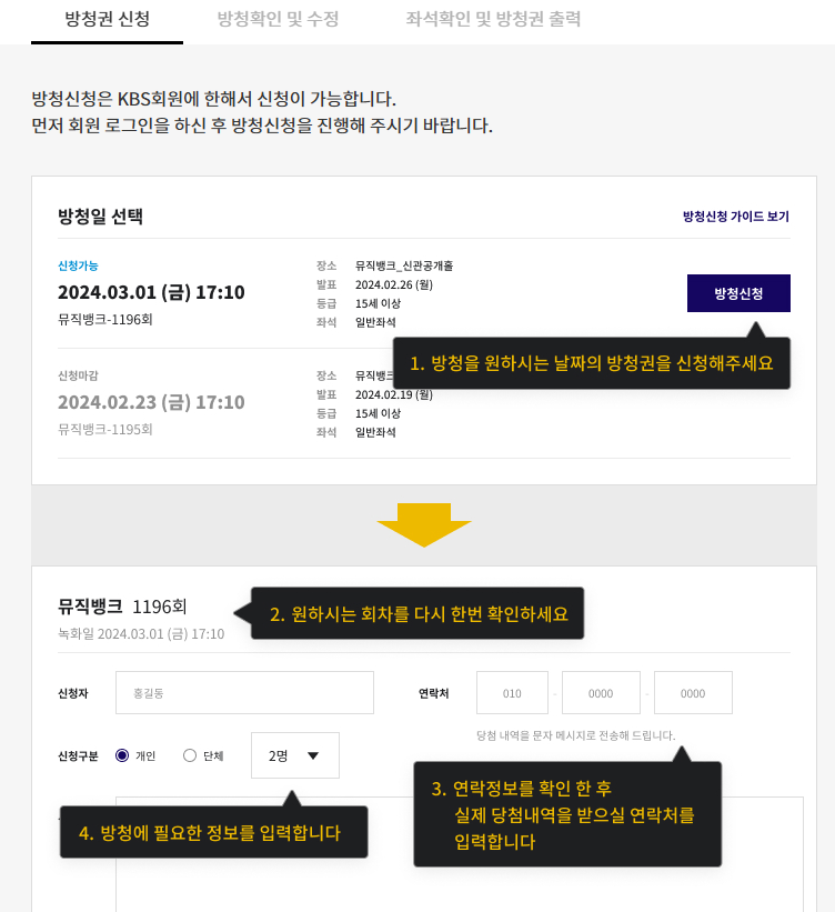 열린음악회 방청 신청은 다음 순서로 진행됩니다.