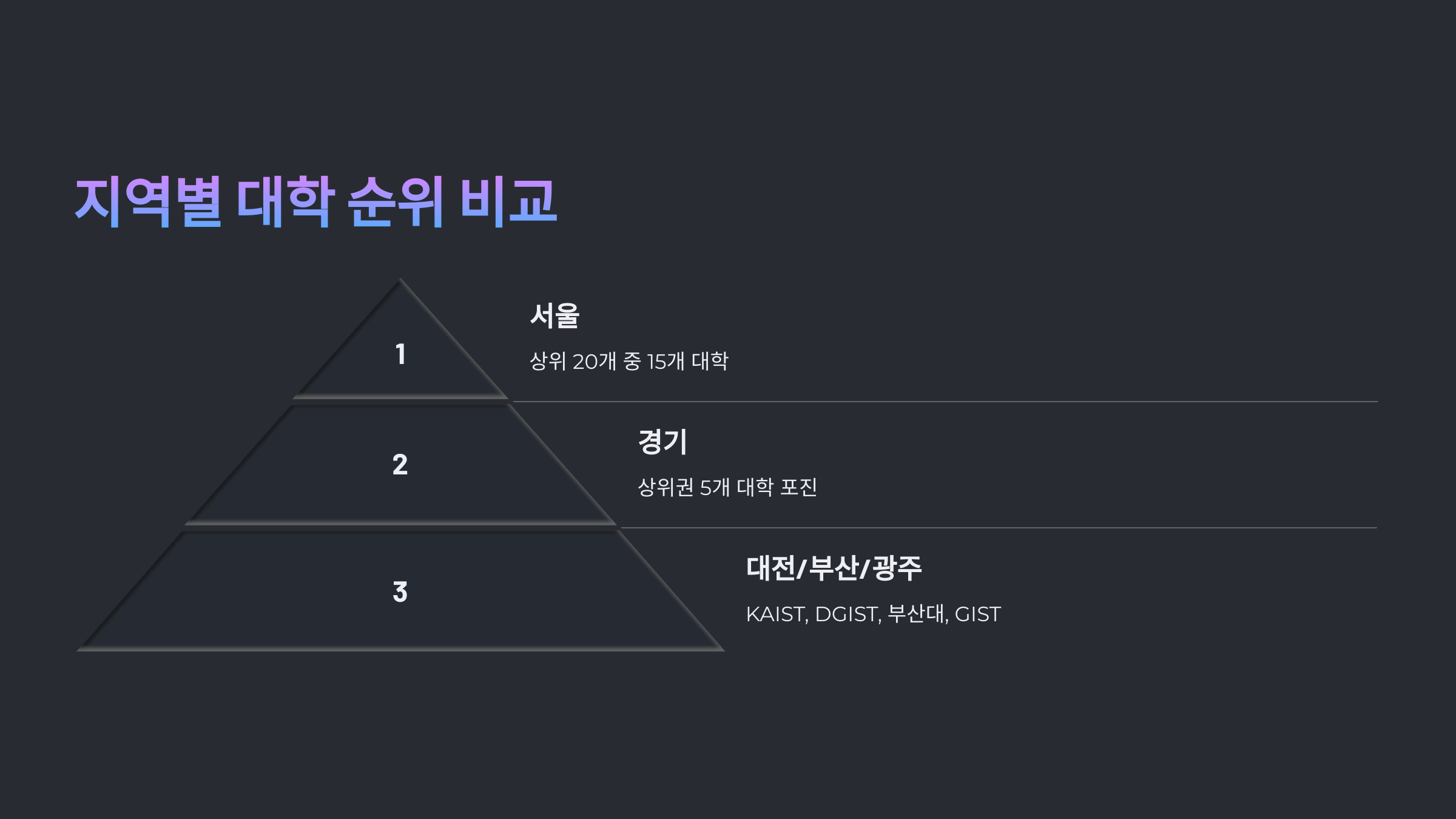 TOP 100 중 약 60%가 수도권에 위치한 대학으로, 여전히 수도권 대학의 강세가 두드러집니다. 서울 소재 대학 중에서는 서울대, 연세대, 고려대의 'SKY' 대학은 물론, 성균관대와 한양대도 상위권을 유지하고 있습니다. 수도권 대학들은 우수한 교수진과 연구 인프라, 폭넓은 네트워크를 강점으로 가지고 있죠.