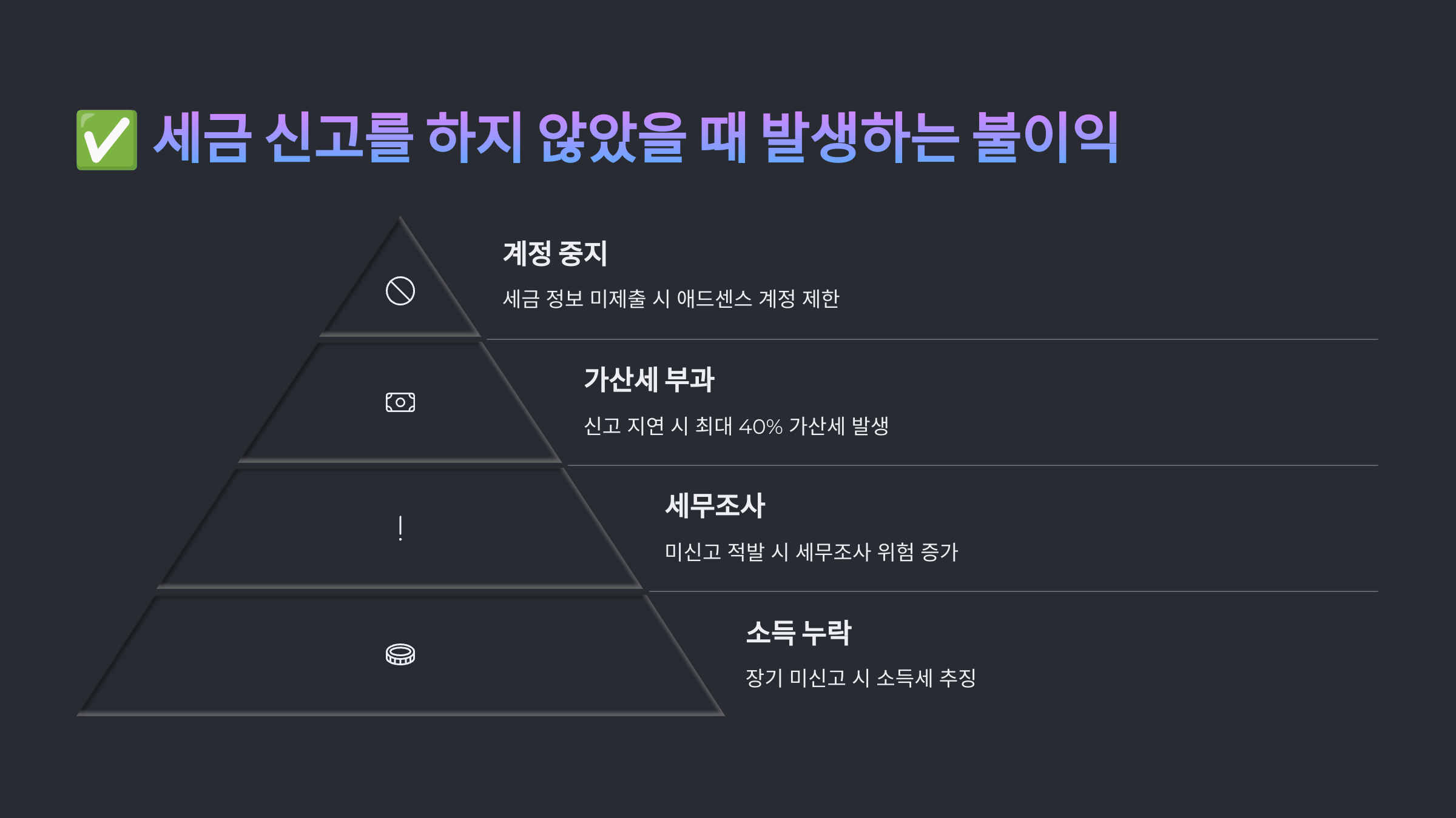 많은 블로거와 유튜버들이 "금액이 적으니까", "취미로 하는 일인데" 라는 이유로 세금 신고를 누락하곤 합니다. 그러나 애드센스 수익은 소득의 한 형태로, 법적으로 신고 의무가 있는 경우가 대부분입니다. 신고를 하지 않으면 생각보다 큰 불이익을 받을 수 있다는 점을 아셔야 합니다.