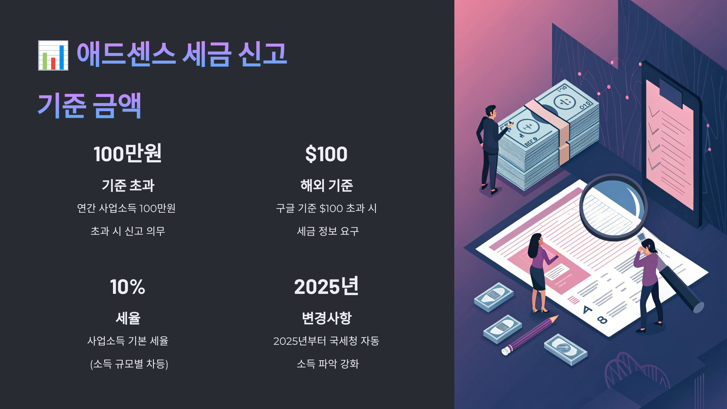 애드센스 세금 신고에서 가장 궁금한 부분은 '얼마부터 신고해야 하는가'일 것입니다. 2025년 기준으로 애드센스 세금 신고와 관련된 주요 금액 기준에 대해 자세히 알아보겠습니다.