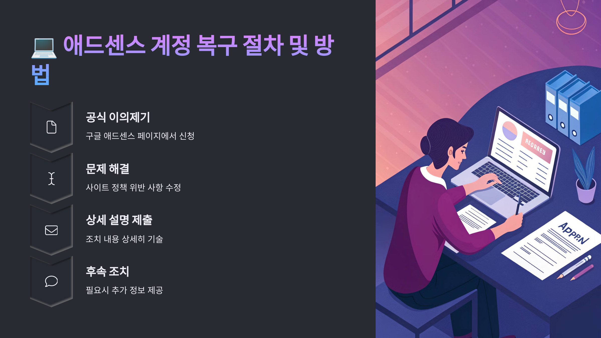 실제 애드센스 계정 복구를 위한 절차는 정지 유형에 따라 달라집니다. 여기서는 두 가지 대표적인 상황에 따른 복구 방법을 알아보겠습니다.