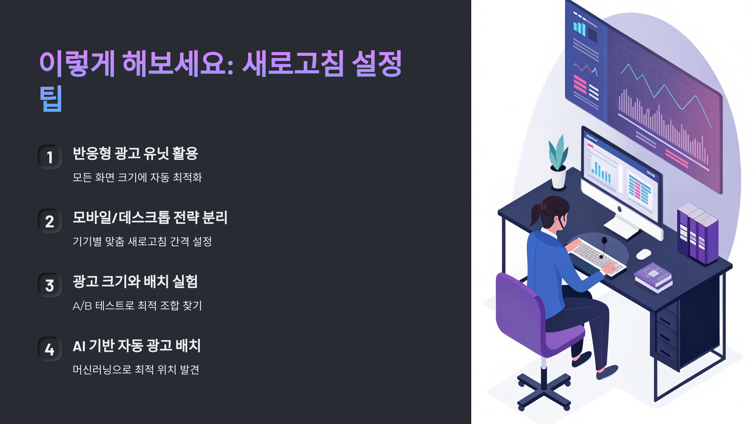 광고 새로고침은 방문자가 페이지를 떠나지 않아도 일정 시간마다 새로운 광고를 불러오는 방식입니다.
