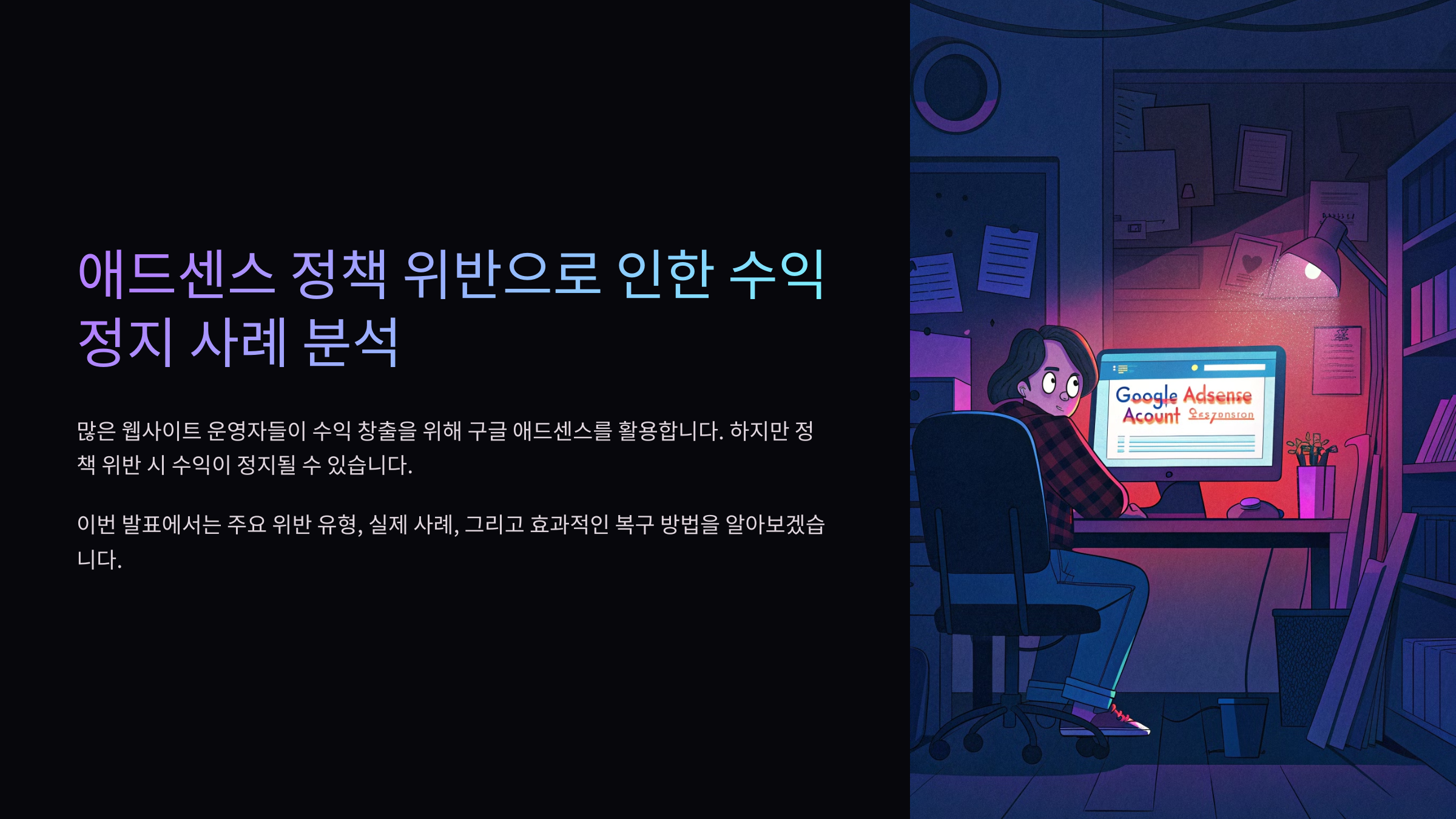 이번 글에서는 애드센스 정책 위반으로 인한 수익 정지 사례 분석에 대해 알아보겠습니다. 블로그를 운영하다 보면 가장 큰 수익원인 구글 애드센스 계정이 갑자기 정지되는 당혹스러운 상황을 맞이할 수 있습니다.