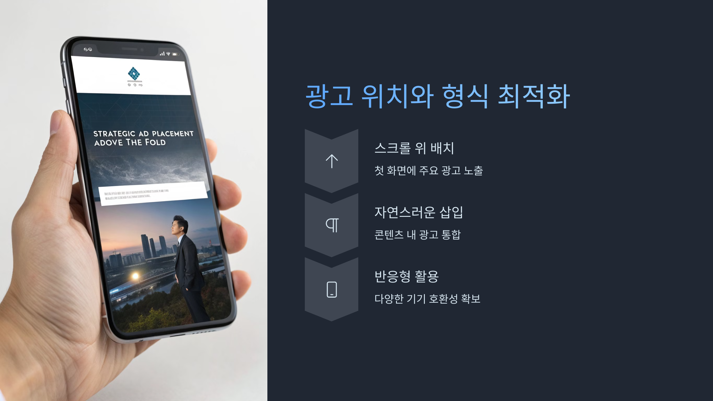 가장 효과적인 광고 위치는 본문 상단과 중단이며, 사용자의 시선이 가장 오래 머무는 지점이기 때문입니다. 사이드바나 하단에 추가로 광고를 배치하면 페이지 전반에 걸쳐 광고 노출 빈도를 높일 수 있고, 반응형 광고를 사용하면 기기별 최적화가 가능합니다.