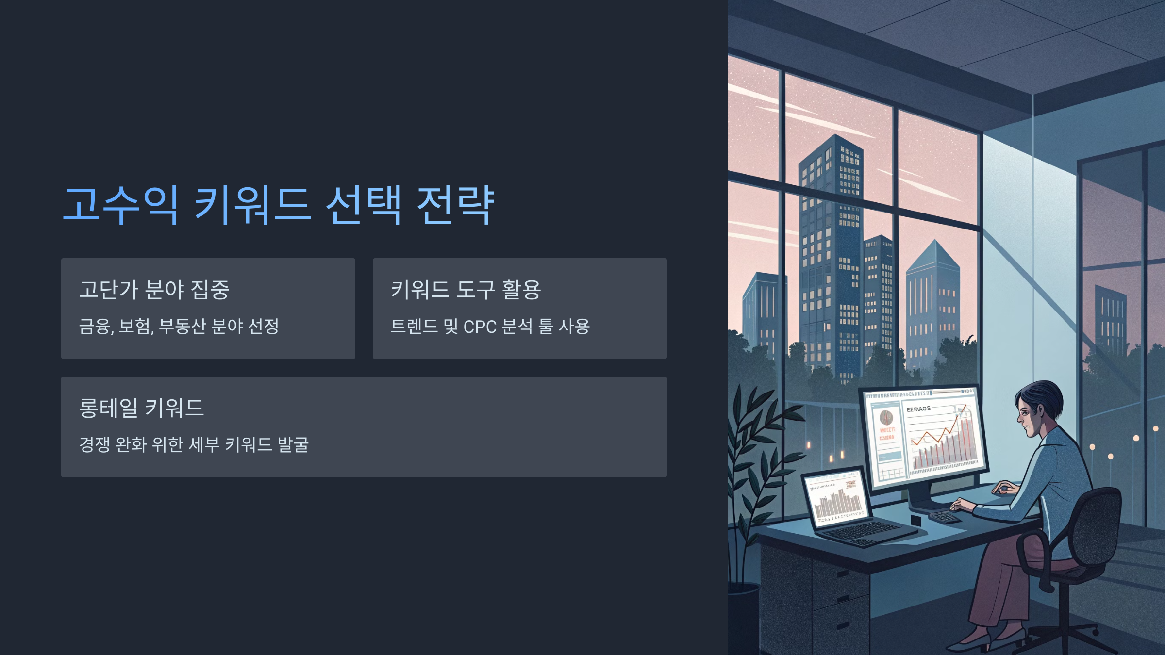 예를 들어 '보험 비교 사이트', '대출 이자 낮은 은행', '변호사 무료 상담'과 같은 실질적인 검색 의도를 담은 키워드를 중심으로 콘텐츠를 구성하면 CPC가 높은 광고 노출 가능성이 커집니다.