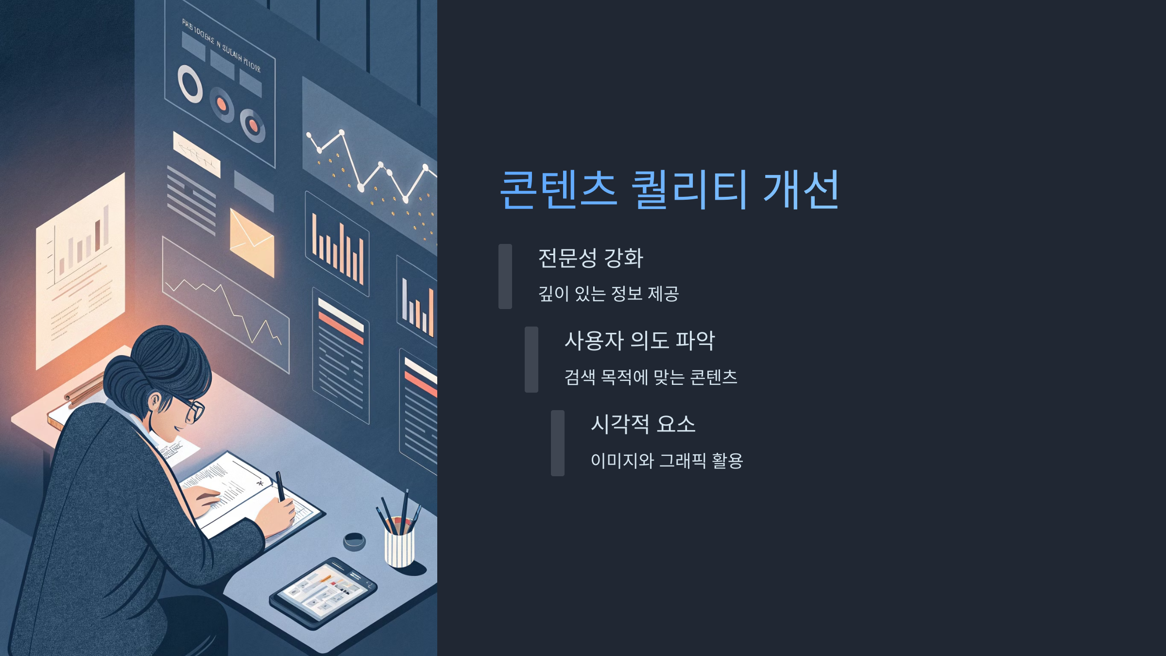 전문성이 느껴지는 콘텐츠, 실제 사례를 포함한 설명, 시각적 요소(그래프, 인포그래픽 등)를 활용한 글은 사용자의 만족도를 높이고 결과적으로 광고 클릭률에도 영향을 줍니다.