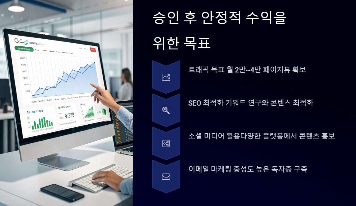애드센스 승인 이후에는 수익을 얼마나 안정적으로 창출할 수 있느냐가 핵심입니다. 이를 위해서는 트래픽 유지와 콘텐츠 관리가 중요합니다. 일반적으로 월 2만~4만 페이지뷰가 확보되면 약 100~200달러의 수익이 발생할 수 있는 수준으로 알려져 있습니다.