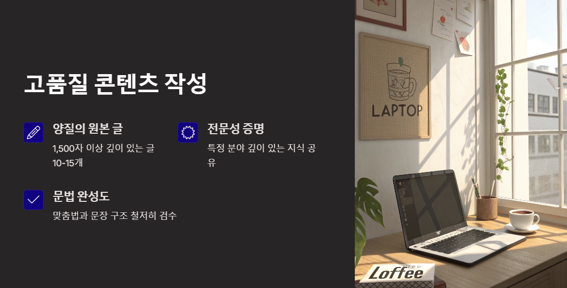 애드센스를 신청하기 전, 사이트가 갖추어야 할 필수 조건이 있습니다. 무엇보다 가장 중요한 것은 고품질의 원본 콘텐츠인데요. 최소 10~15개의 글이 필요하며, 각 글은 1,500자 이상이 권장됩니다.
