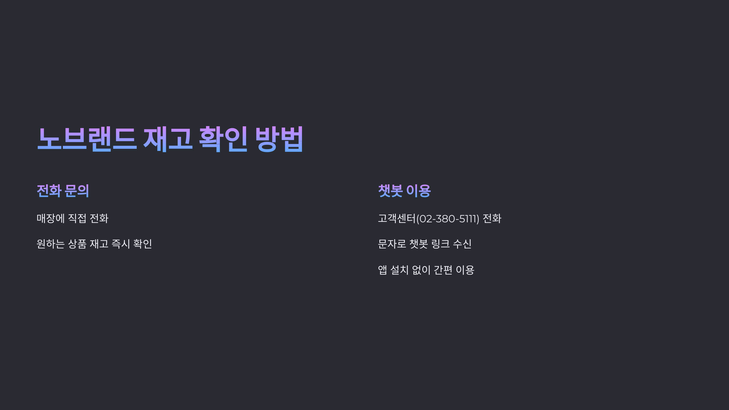 전화 연결 후 “노브랜드 ○○ 제품 재고가 있나요?”라고 직접 물어보면 직원이 실시간으로 확인해 알려줍니다.