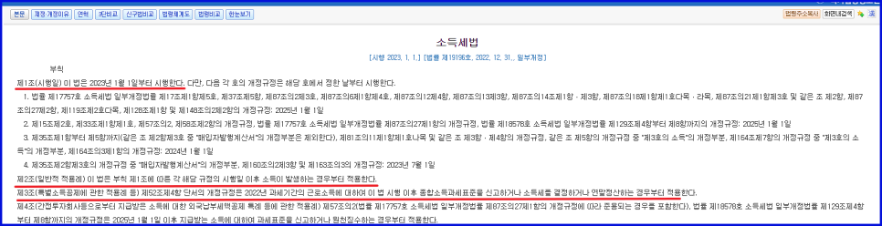 생활법령 사이트 소득세법에 나와있는 변경 안 법령 자료입니다. 빨간줄 쳐진 곳에 포인트가 있습니다.