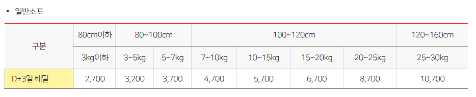 - 요금이 일반 익일 배송보다 높으며, 80cm 이하, 3kg 이하의 소포는 6,500원부터 시작하여 최대 14,500원까지 요금이 책정됩니다.