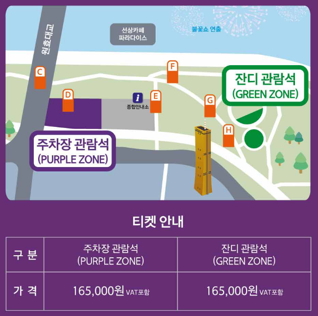 ✅ 티켓·팔찌 교환 부스 위치: 여의도 한강공원 제 1 주차장 E 구역탑 옆