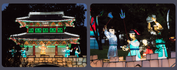 - 내용: 한국의 대표적인 K-콘텐츠인 오징어게임, BTS 등을 주제로 한 유등 전시. 글로벌한 한국 문화를 방문객들에게 소개하고, 해외 관람객들과의 소통의 장을 형성하는 공간.