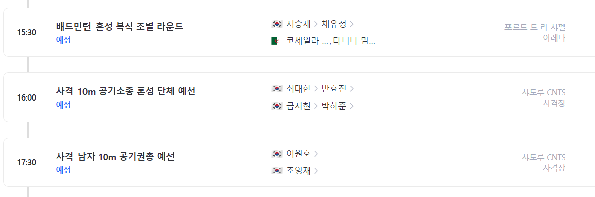 | 2024 파리올림픽 대한민국 경기 일정 종목 정리 (0) | 2024.07.26 |