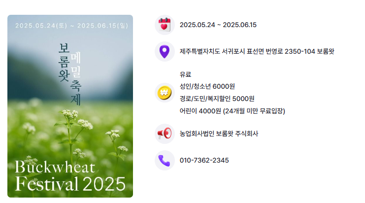 이번 글에서는 2025년 6월, 제주의 바람과 함께 만나는 보롬왓 메밀축제에 대해 일정부터 입장료, 주차, 주요 프로그램까지 꼼꼼하게 알려드리겠습니다.