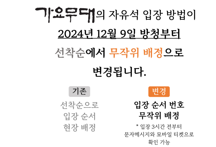 - 지정된 입장 시간이 지나면 자유석으로 전환될 수 있으니 시간을 엄수해야 합니다.