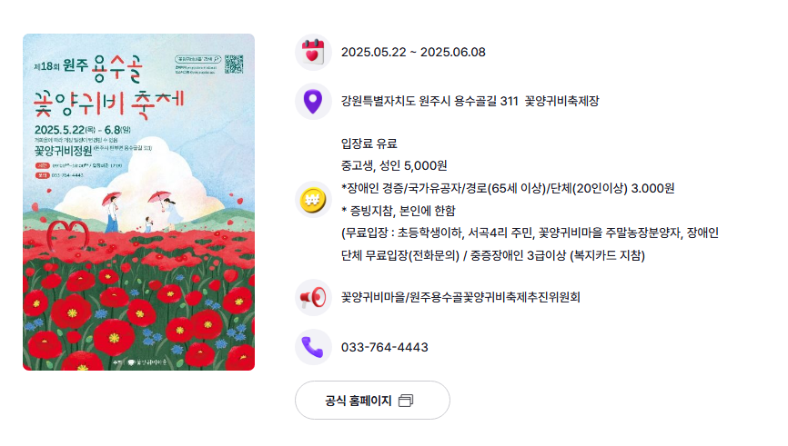 - 장소: 강원특별자치도 원주시 용수골길 311, 꽃양귀비축제장
