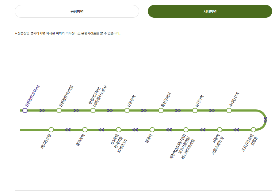 베이튼호텔 → 나인트리동대문 , 웨스턴코업 → 노보텔엠버서더 을지로코업 → 동대문DDP,동대문역사문화공원역 → 토요코인호텔?(스프라지르동대문)→ 퇴계로6가,스카이파크호텔 → 호텔피제이(충무로역) → G3호텔(한옥마을·퇴계로3가) → 명동역 → 한국은행(스프라지르명동) → 서울역3번출구 → 서울역환승센터 → 포포인츠쉐라톤 갈월동 → 숙대입구 → 삼각지역 → 용산우체국 → 신용산역 → 한강대교북단 LG유플러스 → 인천공항 제1터미널 → 인천공항 제2터미널