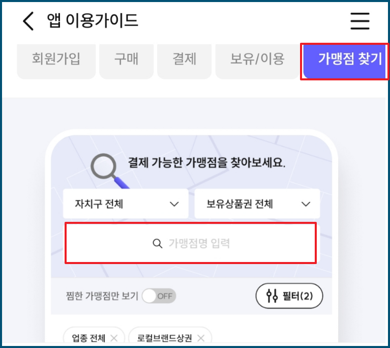 가맹점 찾기 메뉴에서 목록보기 또는 지도로보기를 통해 주변 가맹점을 조회할 수 있으며, 자치구나 보유한 상품권을 선택해 이용 가능한 매장을 검색할 수 있습니다.