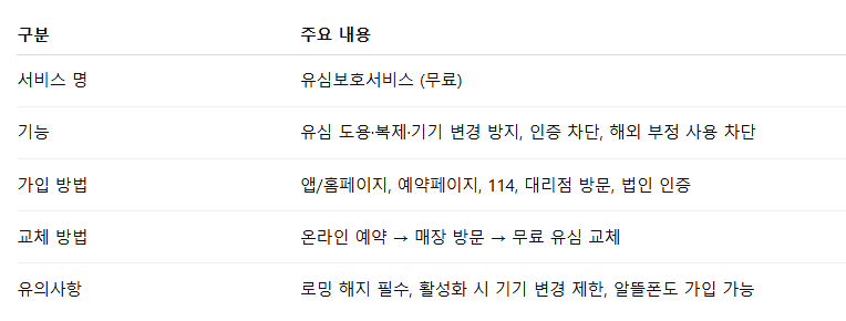 유심보호서비스는 무료 부가서비스로, 내 유심이 다른 기기로 무단 장착되거나 비정상 인증 시도가 있을 때 통화·로밍 등이 자동 차단되는 기능을 갖고 있습니다.