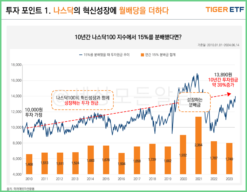 6월 25일 미래에셋 운용에서 나스닥 상승분을 챙기면서 매월 배당금을 받을 수 있는 TIGER미국나스닥100+15%프리미엄 ETF상품을 출시했습니다.