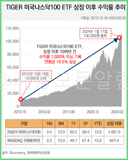 2010년 상장한 TIGER 미국 나스닥100 ETF는 10년간 수익률이 1,000%를 돌파했습니다. 똑같이 1만원에 투자했는데 지수 100% 추종상품은 1,000%가 상승했다는 것을 보여줍니다.
